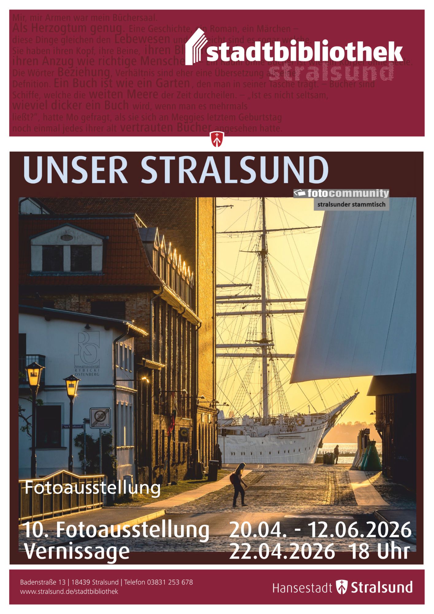 Die Ausstellung ist vom 20. April bis 12. Juni 2026 im Veranstaltungskeller der Stadtbibliothek Stralsund, Badenstraße 13, zu sehen und kann während der regulären Öffnungszeiten besucht werden.