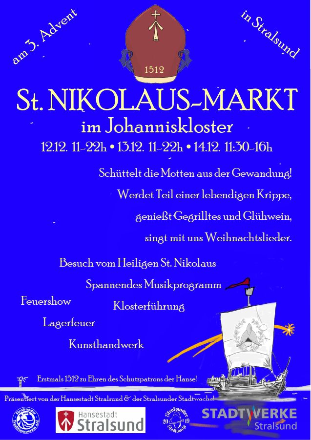 Die Hansestadt Stralsund lässt erneut eine der ältesten Adventstraditionen Norddeutschlands aufleben. Bereits 1512 wurde dem Heiligen Nikolaus als Schutzpatron der Seefahrer, Händler und der Hanse ein eigener Adventsmarkt gewidmet – der damit älteste nachweisbare Weihnachtsmarkt an der Ostsee. Das Originaldokument dazu wird bis heute im Stadtarchiv der Stadt bewahrt.