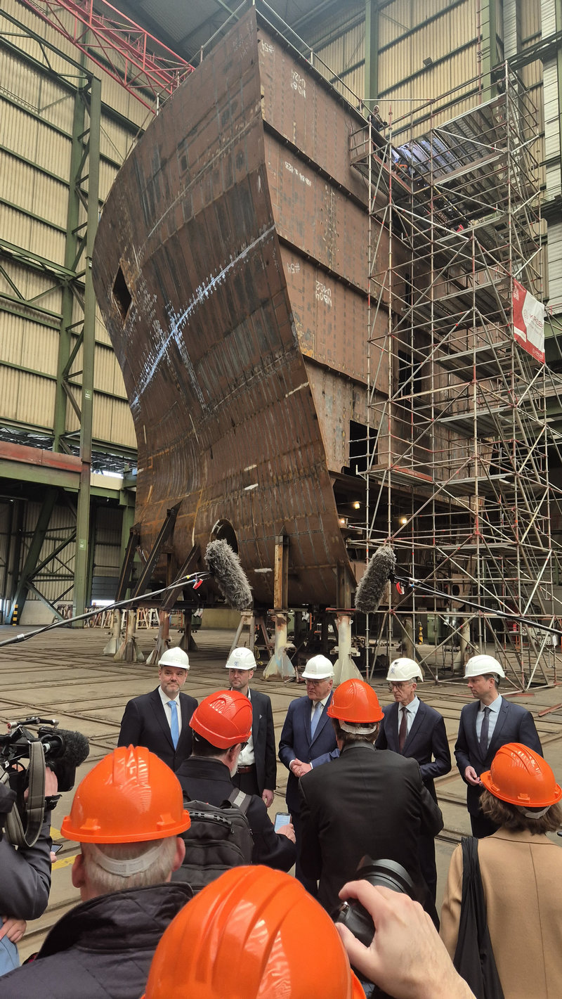 Auf dem Gelände der Volkswerft erläuterten Vetreter der Fassmer-Werft in der großen Schiffbauhalle den Neubau eines Schiffes, wofür gerade ein Segment entsteht.