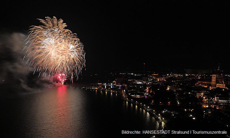 Um 18:30 Uhr wird das spektakuläre Höhenfeuerwerk auf der Nordmole gezündet und zaubert mit seinen bunten Lichterblüten ein unvergessliches Schauspiel in den Abendhimmel über dem Strelasund.